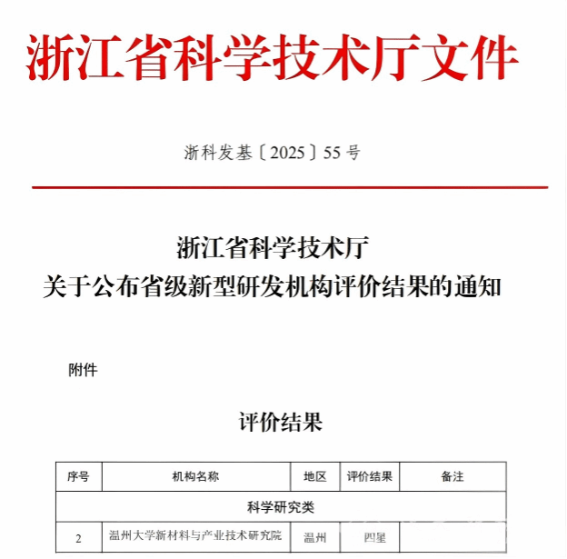 近日,浙江省科学技术厅公布了省级新型研发机构评价结果,温州大学新材料与产业技术研究院获“四星”评价。