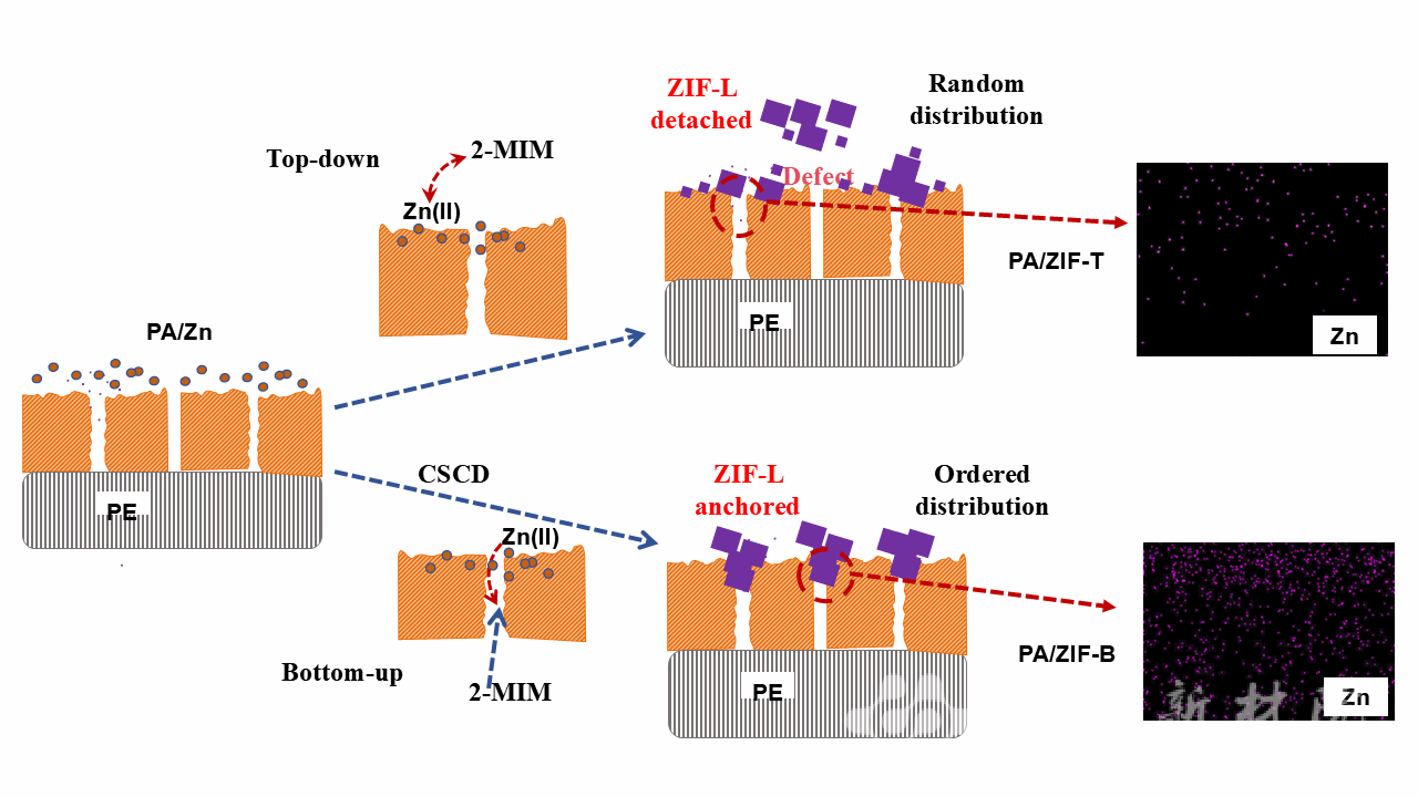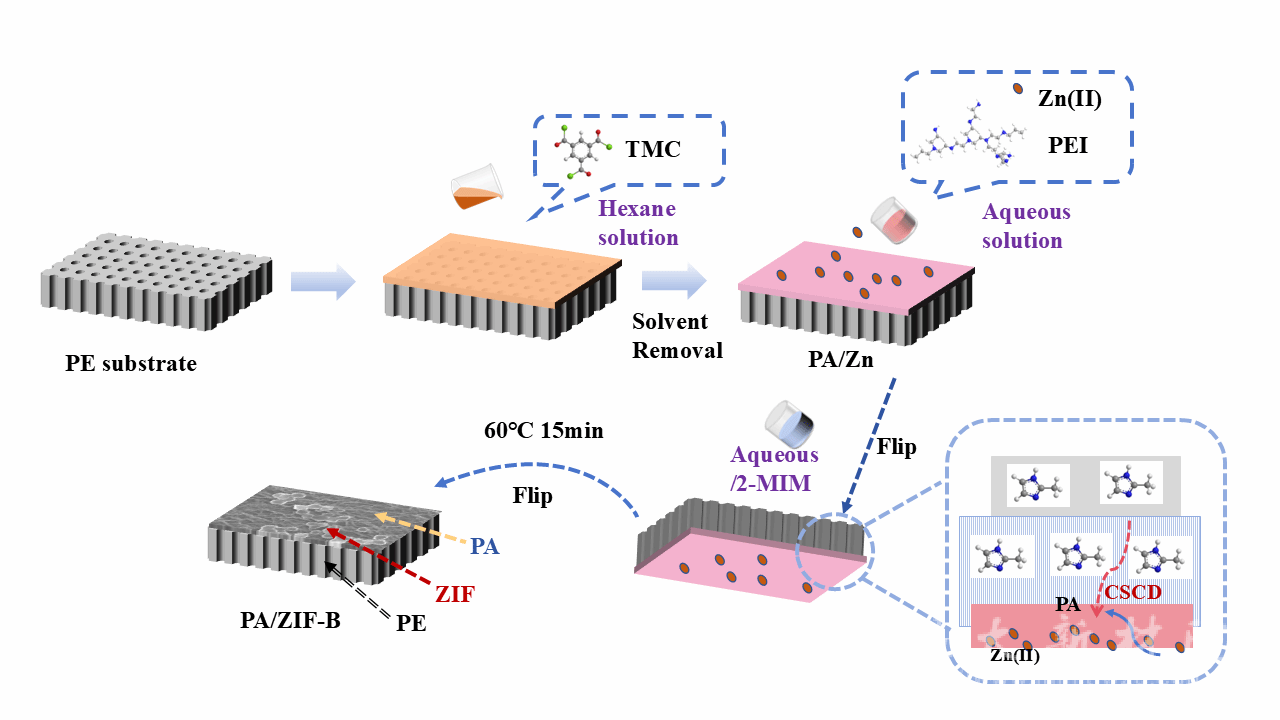 文章旨在解决聚乙烯基聚酰胺(PA/PE)纳滤膜在锂镁分离中存在的渗透通量与选择性权衡问题,开发新型跨基材反向扩散(CSCD)策略原位生长并固定 ZIF-L 粒子;通过研究配体扩散方式对 ZIF-L 粒子生长分布及膜分离性能的影响,明确 CSCD 方法调控膜结构与性能的机理,验证其在突破分离性能上限中的优越性。