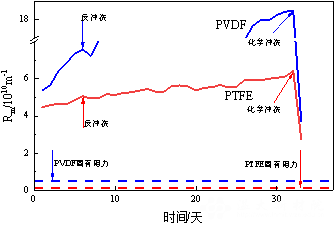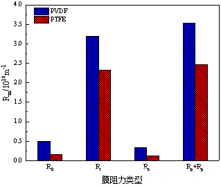 PTFE中空纤维膜和PVDF中空纤维膜运行期间膜阻力变化及膜阻力类型对比