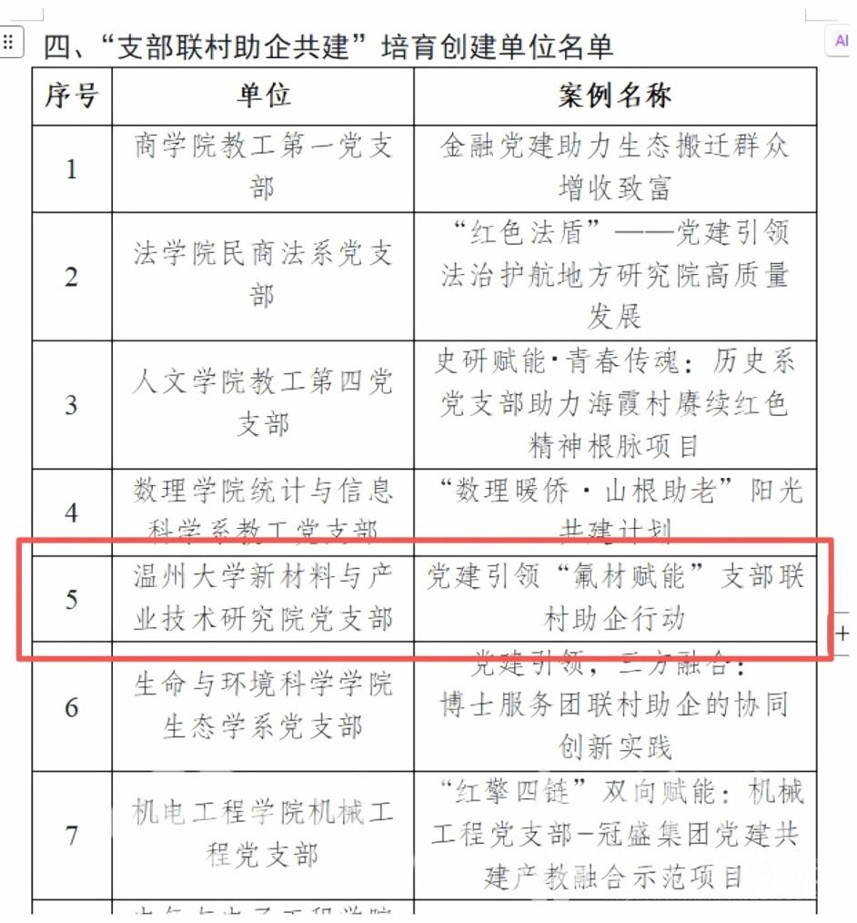 近日,温州大学党委组织部公布“一融双高”党组织等培育项目立项结果,温州大学新材料与产业技术研究院党支部凭借案例《党建引领“氟材赋能”支部联村助企行动》成功入选“支部联村助企共建”培育创建单位名单。